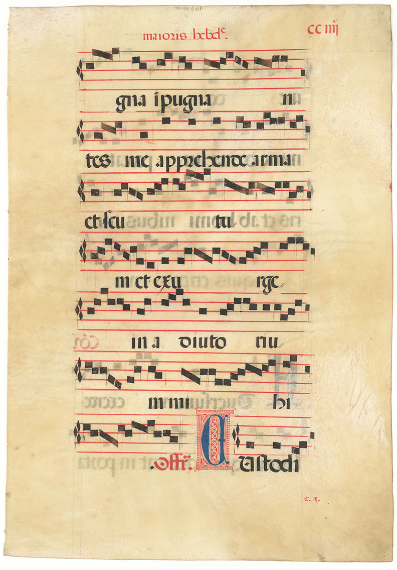 DESCRIPTION: This large and beautifully preserved manuscript leaf comes from a Latin Antiphonary dating to around 1500. Likely produced in a German scriptorium, it features red and black musical staves and Latin text on both sides. A colorful painted initial marks the beginning of a chant, adding a vivid focal point to the page. Still clean and vibrant, the leaf is a striking example of the artistry found in late medieval liturgical books.