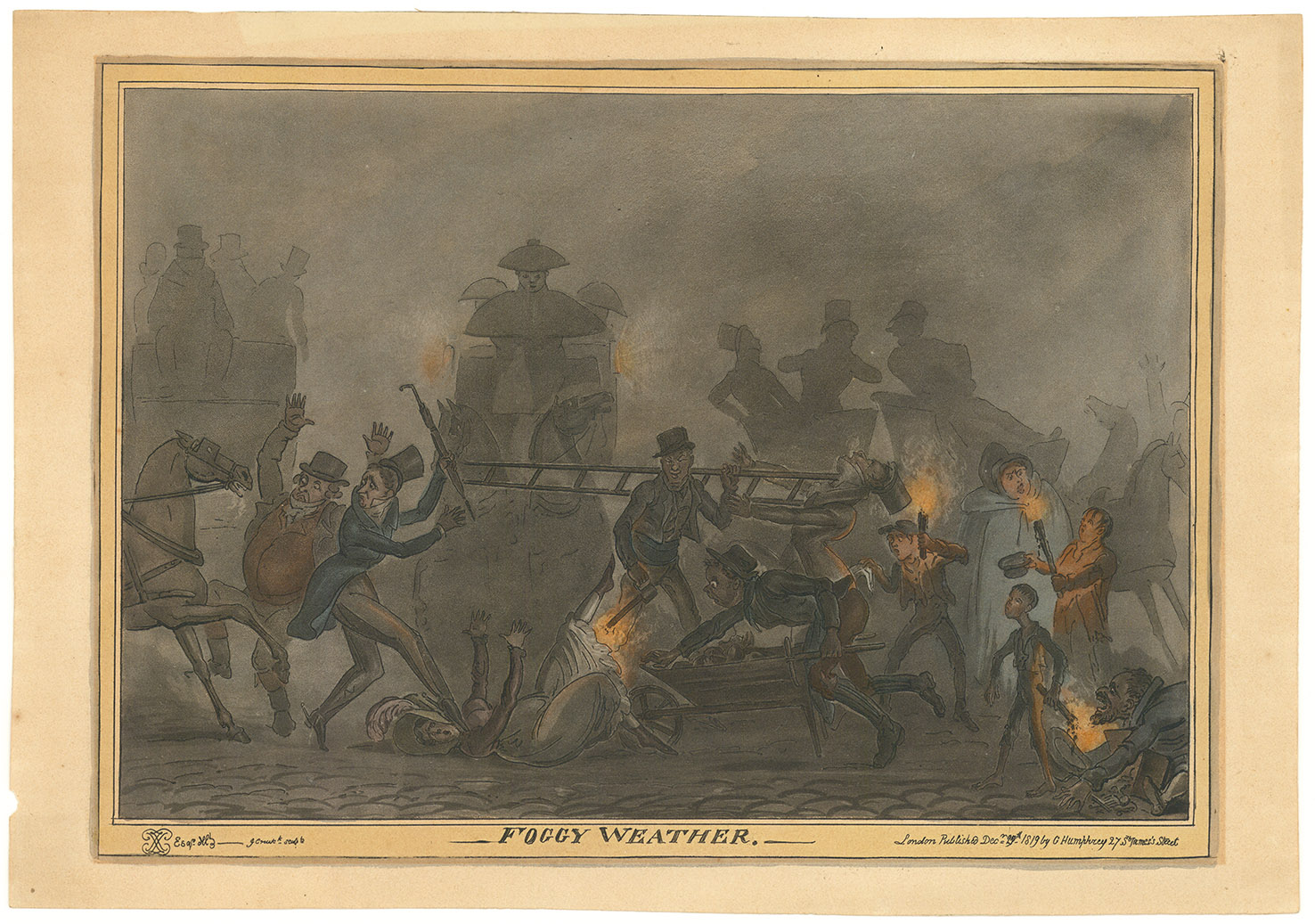DESCRIPTION: This spirited print captures the chaos of a fogbound London street, exaggerating the city's famously overcast weather for comic effect. A boy pushing a handcart barrels into a fashionable lady, knocking her to the ground just as a startled dandy steps on her neck. Another gentleman is struck by a lamplighter's ladder. On the right, three ragged link-boys dart through the gloom—one caught in the act of picking a pocket. Their torches, along with the lamplighter's flame and a faint glow in the distance, barely penetrate the dense fog. In typical Humphrey fashion, the scene turns a familiar inconvenience into a raucous satire of urban life in London.