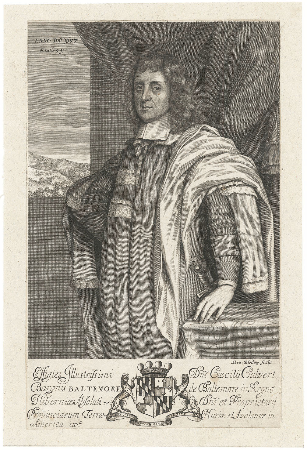 DESCRIPTION: <b>Lord Baltimore</b><br><br> This 1657 line engraving by Abraham Blooteling depicts Cecil Calvert, 2nd Baron Baltimore (1606–1675), the founder of the Maryland colony in North America. A key figure in early colonial history, Calvert inherited the charter for Maryland from his father, George Calvert, and governed the province for over forty years, promoting religious tolerance for English Catholics.<br><br> Abraham Blooteling (1634-1690) an accomplished Dutch engraver and print publisher, is known for his refined technique and detailed portraiture. He is associated with over sixty portrait engravings, and this particular work reflects the formal style and dignified presentation typical of mid-17th-century European portrait prints.