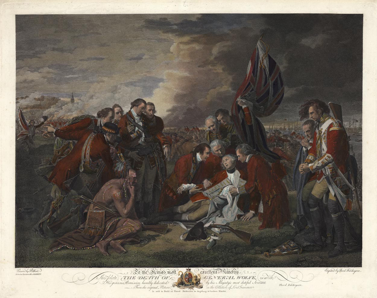 DESCRIPTION: Painted by B. West, Historical painter to His Majesty. Engraved by Theod Falckeysen. <br><br> The engraving was published in London by Woollett, Boydell, and Ryland, on January 1, 1776 after one of Benjamin West's most famous paintings of the same title. The piece was particularly noteworthy, and controversial, because it was the first major painting of a contemporary event to dismiss classical norms - the soldiers are depicted in modern uniforms instead of classical drapery. General Wolfe had been mortally wounded at the Battle of Quebec on September 13, 1759 during the French and Indian War (also known as the Seven Years' War).