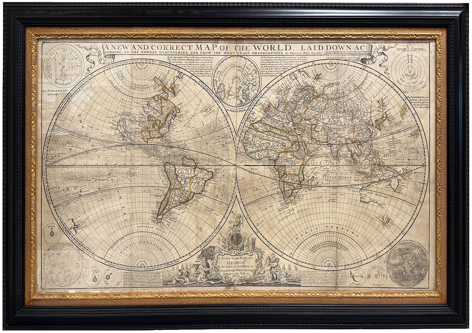 DESCRIPTION: A fine large-scale, double hemisphere map of the world.<br><br> This map was produced by Hermann Moll, an important, late 17th, early 18th century London based mapmaker.<br><br> This double hemisphere map has a great deal of information delineated into it. It is one of the first to record prevailing wind directions based on scientific observation. And the direction of the ocean currents, that Moll gleaned from his esteemed contemporary Sir Edmond Halley. Each corner of the map features very detailed and elegant astronomical diagrams, including; the planetary systems according to both Ptolemy (geo-centric) and Copernicus (helio-centric) (with the addition of the path of a comet), the appearance of the Sun according to Athanasius Kircher; and the Appearance of the Moon according to Jean-Dominique Cassini. The five known planets are depicted as well, Saturn with its ring and Jupiter with four moons.<br><br> As to the cartography:<br> At the time, good sections of the world still needed to be discovered, surveyed and cultures understood. California is shown as an island, a prominent River of the West is "laid down according to the Baron Lahontan's discoveries," and most of the Arctic is labeled "Parts Unknown." In northeastern Asia, Iesso (Hokkaido) is shown to be part of Siberia with Company's Land lying just offshore. Only the western and northern coasts, and a bit of Diemens Land, are shown in Australia. Only a small bit of the west coast of New Zeeland is shown. Above the cusp is a northern polar projection.<br><br> Of particular interest is the vitriolic attack Moll made on his competitors, particularly the French cartographer, Nicolas Sanson (whose maps have been condemned and found to be notoriously false). Moll goes on to claim the Dutch maps are inaccurate and often illegal piracies.<br><br> There are ten known states of the map with this being the 4th.