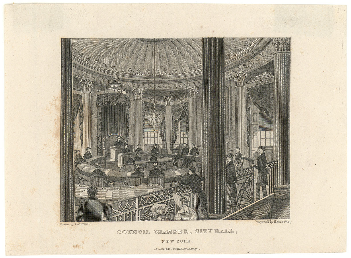 DESCRIPTION: This small steel engraving from around 1850 shows the Council Chambers inside New York City's historic City Hall. It captures the elegant neoclassical interior with tall ceilings, detailed moldings, and formal furnishings. Built in 1812, City Hall housed the city's government, with the chambers serving as the center of legislative activity.
