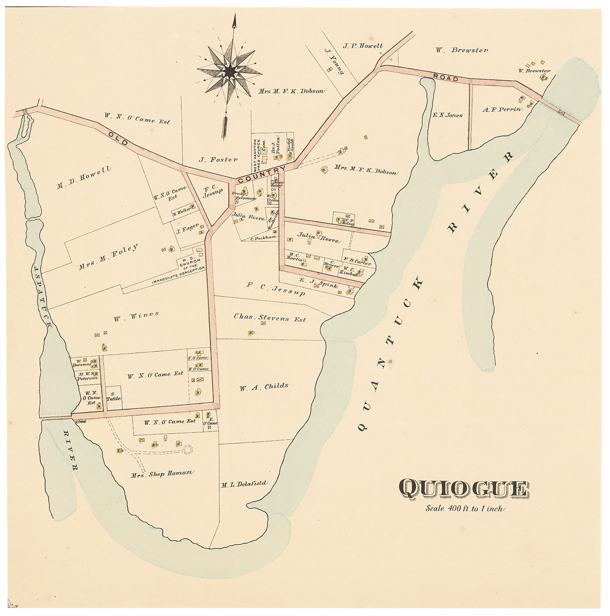 DESCRIPTION: A handsome map of the village. Notes building owners, lots and structures. This map appeared in Hyde's very scarce oversized "Atlas of Suffolk County Long Island, New York... South Side - Ocean Shore.” Drawn on a scale of 400 feet to the inch.<br><br.> The is the lower left portion of a larger sheet that showed three different towns.