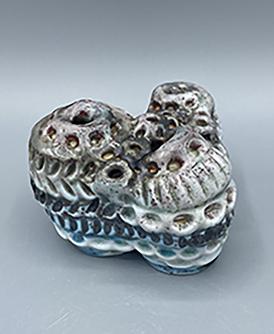 DESCRIPTION: Stamped with chop. This piece was soda fired. The kiln for a soda fire is generally around 2300°F (1260 °C) – soda ash (sodium carbonate) or baking soda (sodium bicarbonate) vaporizes in the heat and interacts with the clay surface. This process is known for its dramatic and unpredictable results.
