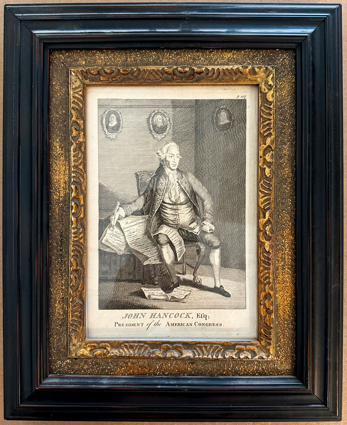 DESCRIPTION: A handsome portrait of John Hancock shown seated and writing a letter to the people of Ireland. The Resolutions of the Continental Congress also rests on the table. At his feet are the Boston Port Bill and a Proclamation.<br><br> John Hancock, 1737-1793 was a prominent merchant and statesman of Boston. He also was a Patriot during the American Revolution. He served as president of the Second Continental Congress and was the first and third Governor of the Commonwealth of Massachusetts. He is best remembered for his large and stylish signature on the Declaration of Independence, drawn so that King George III would be able to read his name without difficulty.<br><br> This print appeared in of "An impartial history of the war in America, between Great Britain and the United States" by William Murray.