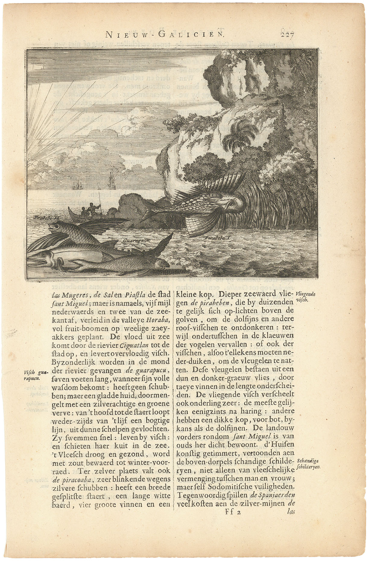 DESCRIPTION: This leaf from Montanus’ celebrated E Nieuwe en Onbekende Weereld (1671), published in Amsterdam by Jacob van Meurs, describes San Miguel, a fertile valley rich with fruit trees and nourished by the river Ciguatlan, whose waters abound with fish, including the great guarapucu and the gleaming piracoaba. Montanus also provides one of the earliest European accounts of flying fish, or pirabeben: “Dieper zeewaerd vliegende gen de pirabeben, die by duizenden gelijk sich op-lichten boven de golven, om de dolfijns en andere roof-visschen te ontdonkeren: terwijl ondertusschen in de klaeuwen der vogelen vervallen: of ook der visschen, alsoo ’t elckens moeten neder-duiken, om de vleugelen te natten” (“Farther out to sea fly the pirabeben, which by the thousands rise above the waves together to elude dolphins and other predatory fish, though meanwhile they fall into the claws of birds, or back to the fish, since they must continually dive down to wet their wings”). The account emphasizes both the marvel and the vulnerability of these creatures, their membranous fins likened to wings, enabling them to escape one danger only to encounter another, and to Montanus’ 17th-century readers, such passages epitomized the strangeness and wonder of the New World.