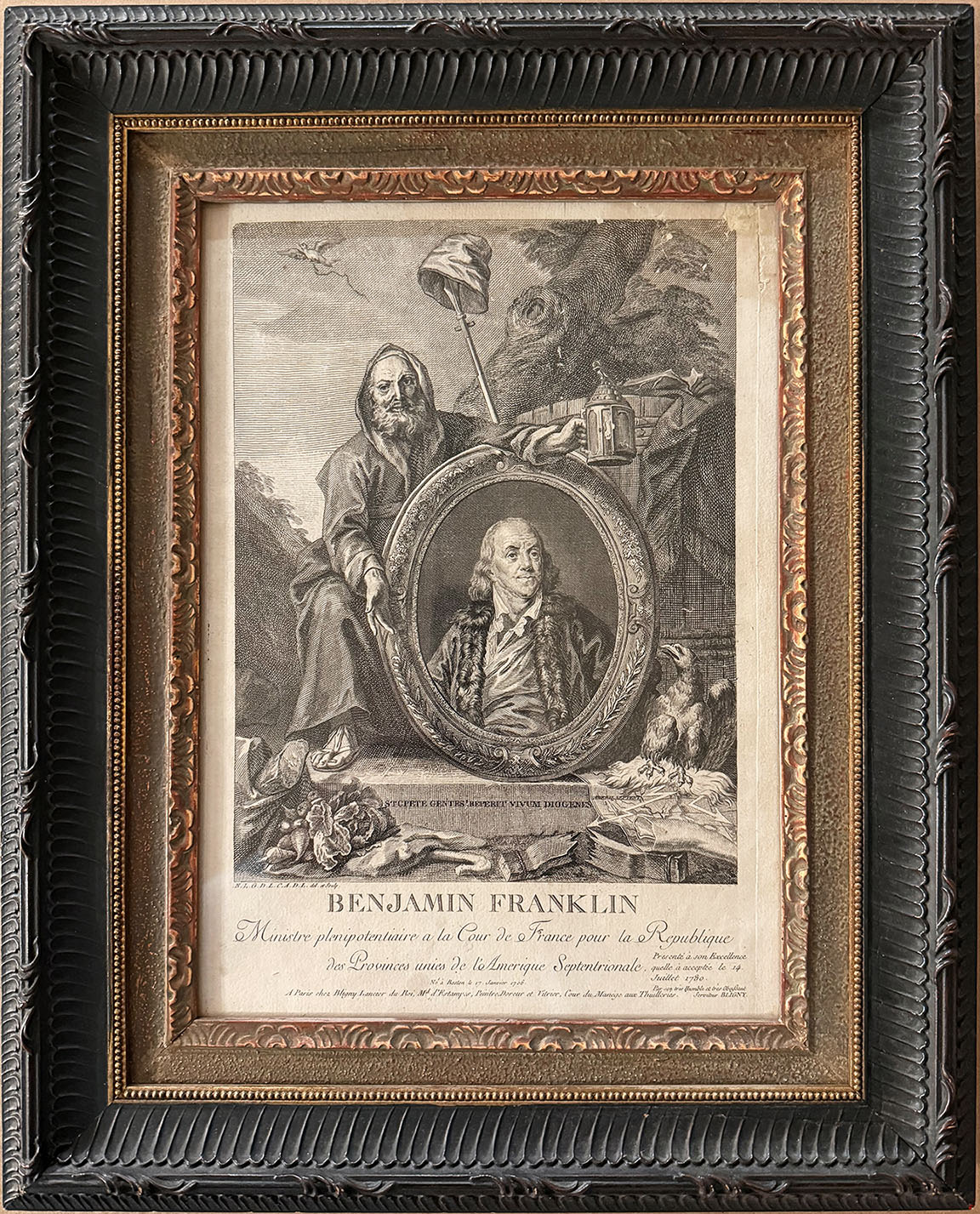 DESCRIPTION: A fine emblematical portrait of Benjamin Franklin.<br><br> The Greek philosopher Diogenes (left) supports the bust portrait of Franklin in a carved oval frame, the portrait being by Anne Rosalie Filleul, wearing a fur-trimmed robe over a loose shirt. Diogenes holds out his lantern; he supports the portrait on a stone block inscribed "Stupete gentes! Reperit vivum Diogenes"; behind him is a spear on whose point is a liberty cap. Along the lower edge are turnips and a cabbage, symbols of frugality, a staff, a broken yoke, an emblem of the power of England in America, an eagle from whose claws spring thunderbolts over a map of "Ameriq. Septent" In the sky is a bird which has been tethered by a cord flying away, symbolizing liberty.<br><br> A complex and rather handsome portrait of this great American Founding Father.