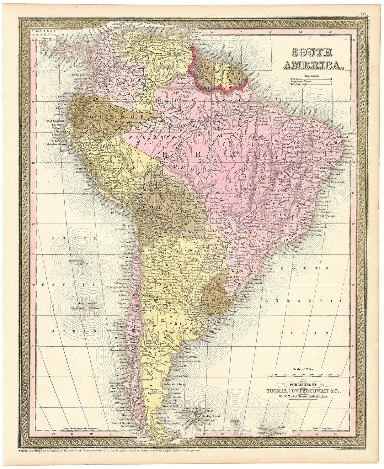 DESCRIPTION: Full-color map showing the countries of South America with capitals, towns, and political boundaries. Issued from 253 Market Street, Philadelphia, as part of Cowperthwait’s atlases.