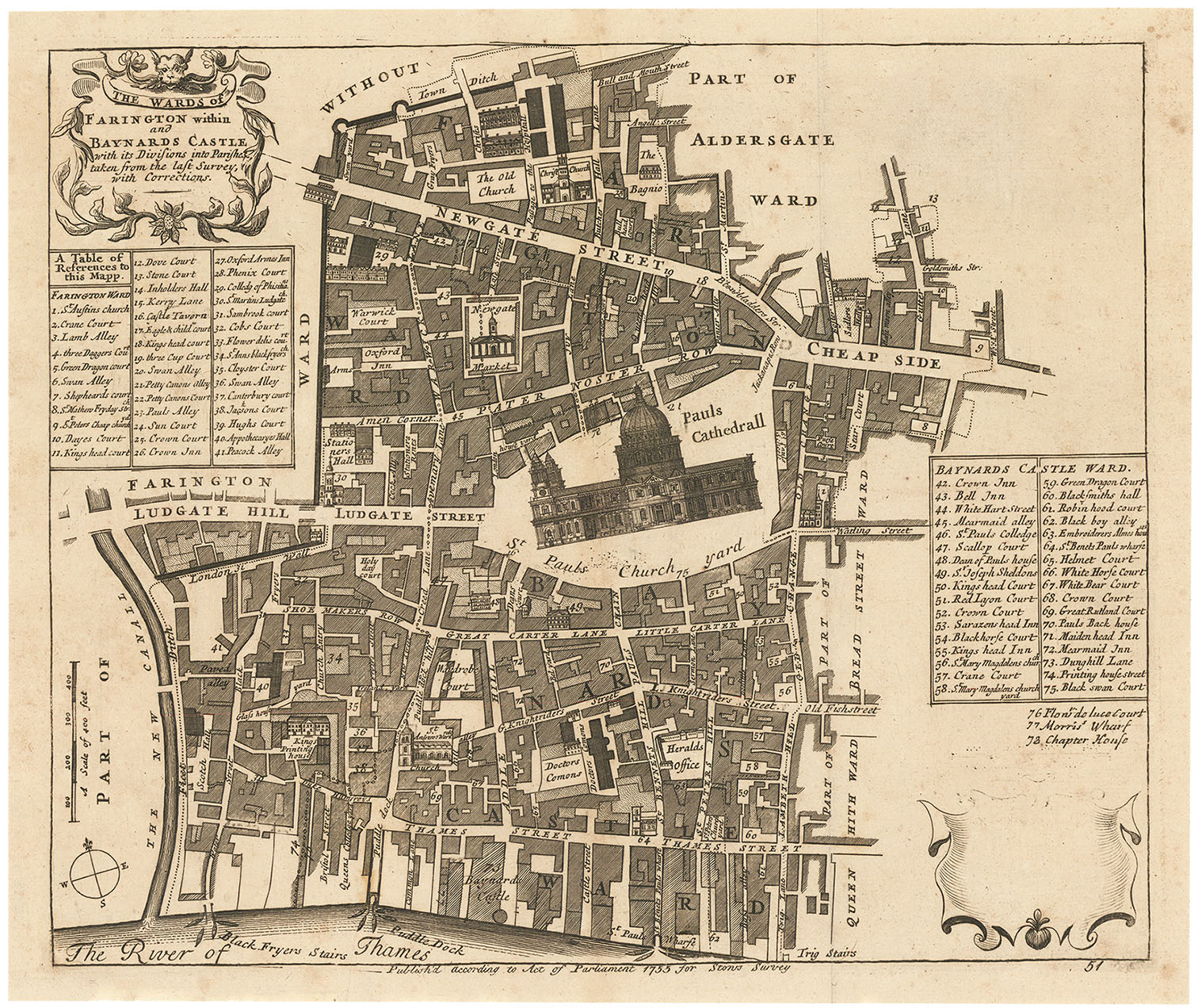 DESCRIPTION: This map shows are area centerd on St. Paul’s Cathedral. Newgate Street is shown along the upper portion, Ludgate Street below, along with the western end of Cheapside, , Grate and Little Carter Lanes. The River Thames is shown along the lower edge. This map appeared in volume II of the sixth edition of "A Survey of the Cities of London and Westminster. Corrected, Improved, and Very Much Enlarged. to the Present Time" completed by John Strype. 1755