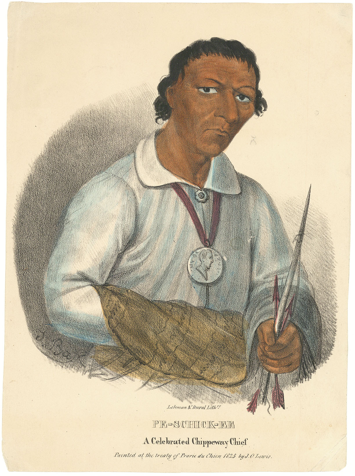 DESCRIPTION: This portrait depicts Pe-Schick-Ee, a noted leader of the Chippewa (Ojibwe) people, rendered by James Otto Lewis during his travels among Native nations in the Great Lakes region. Lewis’s Aboriginal Portfolio was the first major color-plate publication devoted entirely to Native American subjects, preceding McKenney and Hall’s History of the Indian Tribes of North America. Issued between 1835 and 1836 in ten parts, the series captured numerous tribal dignitaries and emissaries who attended treaty councils during the 1820s and 1830s. Pe-Schick-Ee is portrayed in ceremonial attire, his expression composed and dignified, exemplifying Lewis’s effort to record both likeness and cultural presence rather than romantic stereotype. Surviving impressions from this early American lithographic series are now rare, as the project was plagued by financial difficulties and limited distribution.