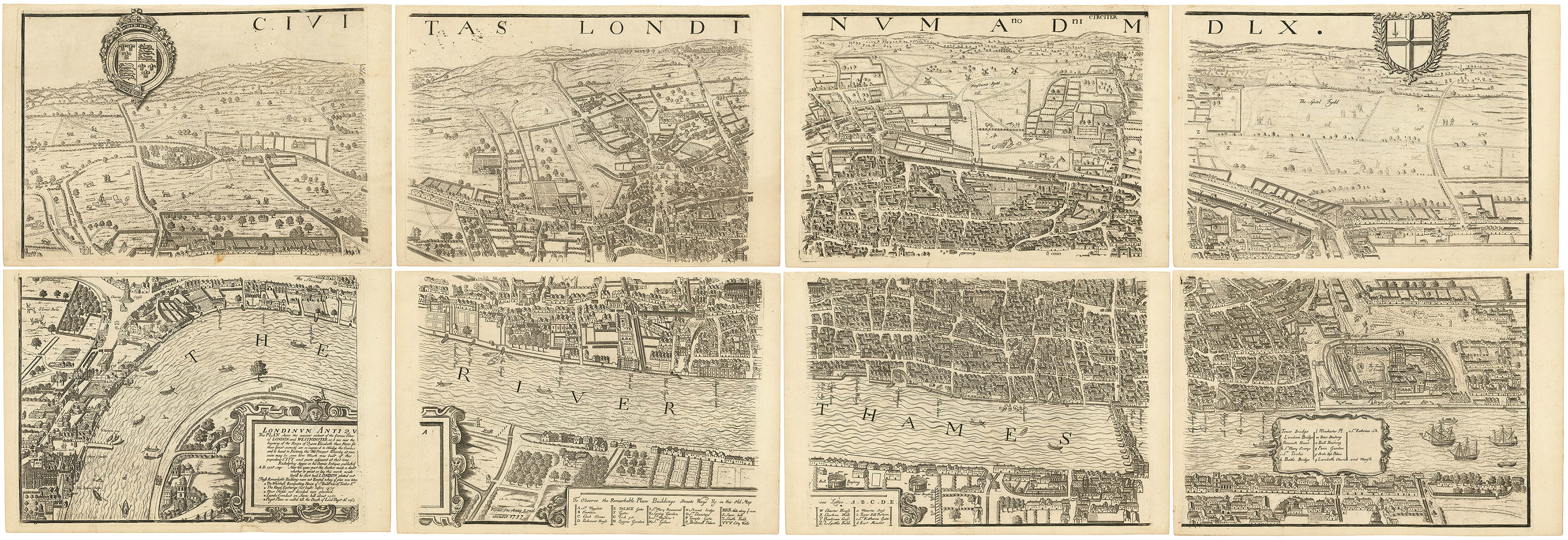 DESCRIPTION: One of the most detailed maps of Elizabethan London, covering an area from the Tower of London in the east to Westminster Abbey. This map shows the city as it was in 1560.<br><br> The title continues with: "This Plan shews the ancient extent of the famous Cities of London and Westminster as it was near the begining of the Reign of Queen Elisabeth these plates for their great scarcity are re-engraved to oblidge the Curious and to hand and to hand to Pasterity this Old Prospect Wherby at one view may be seen how Much was built of this populous City and parts adjacent at that time."<br><br> It captures the City as it was developing beyond its original walls, but with farms and pastures still much in evidence nearby. Deer can still be seen in St. James Park. The major roads of entry to the city are shown and named, many of which are now well-known thoroughfares. Much of the Roman built London wall is still intact, and the Tower complex is well detailed. At the very lower left is Westminster Abbey and just to the north is Scotland Yard. St Pauls Cathedral is shown without a steeple, which fell in 1561, offering some corroboration to Vertues 1560 date as the time depicted by the plan. Bear and bull baiting rings can be seen in the plan on the south bank of the Thames across from the City. Although produced in the eighteenth century, this work was based on an extremely rare, sixteenth century plan, known, according to Howgego, in just three examples. In fact, the original, attributed to Ralph Agas by Vertue on this plan, is referred to as being of great Scarcity in the title of this map. There is some doubt as to whether Agas was the maker of the original plan, as Vertue is the sole source for that attribution. Howgego states that the eight sheets that make up this plan were engraved in pewter, a metal very rarely used in the production of maps.<br><br> George Vertue (1684-1756) was a prominent early 18th century engraver and antiquarian. His eclectic and artistic tastes drew him into the tastemaking circles in London during his time. He was a contemporary of William Hogarth and both were members of the Rose and Crown Club. He was also a member as well as the official engraver for the London Society of Antiquaries.<br>br>