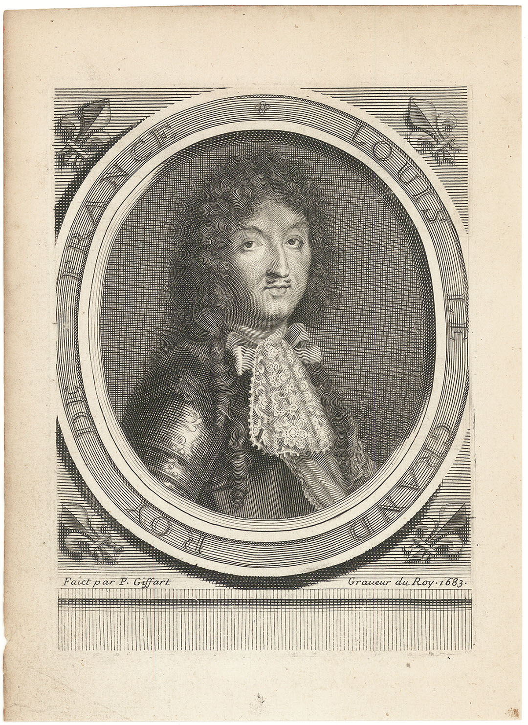 DESCRIPTION: Copper engraving depicting King Louis XIV of France, known as the Roi-Soleil or “Sun King.” The portrait shows the monarch in regal armor, with the Order of the Holy Spirit and other symbols of royal power, surrounded by an ornate architectural frame. This image was published in Mallet’s monumental Description de L’Univers, one of the most ambitious encyclopedic works of the seventeenth century, illustrating the geography, politics, and rulers of the world. Allain Manesson Mallet (1630–1706), a French engineer, cartographer, and court geographer to Louis XIV, combined artistry and precision in his engravings. His depictions of monarchs and world figures reflect both the grandeur of the French court and the Baroque fascination with order and authority. This engraving captures Louis XIV’s self-fashioned image as the embodiment of absolute monarchy and the radiant center of the French state.