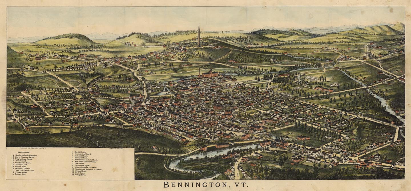 DESCRIPTION: This lithograph was initially a fold up pocket view. The original cover is long gone The key at the lower left lists many of the area's important landmarks, most notably the "Bennington Battle Monument", commemorating the 1777 American defeat of a British raiding force during the Revolution.<br><br> This 1891 printing was issued in folding "pocket map" format as a souvenir for the August 1891 celebration of the centennial of Vermont's joining the Union.