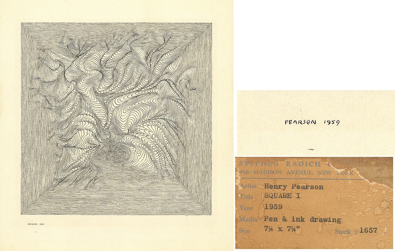 • DESCRIPTION: An early representation of Op Art from one of the pioneer of the movement.<br><br> Signed and dated in ink. "Pearson 1959".<br><br> Henry Pearson 1914-2006) Born in Kinston, North Carolina. Studied art at the University of North Carolina where he received his B.A. and later at Yale University where he received an M.F.A. Pearson spent eleven years in the army during and after WWII where he worked on topographical maps in the Pacific theater.<br> Pearson returned to the United States in 1953 and enrolled at the Art Students League in New York where he studied with Reginald Marsh and Will Barnet The Op-Art Movement was beginning to gain popularity and Pearson’s interest in topography and the landscape lead him to experiment with optical effects and his own fine line drawings. Today he is considered to be one of the pioneer in the movement. His artwork was included in the Museum of Modern Art exhibition The Responsive Eye. (1965). He later received a retrospective exhibition at the North Carolina Museum of Art in 1969.<br><br> This particular drawing retains the original sales label from the Stephen Radich Gallery where the title is given. It also bears a inventory or stock number “1657” from the gallery.