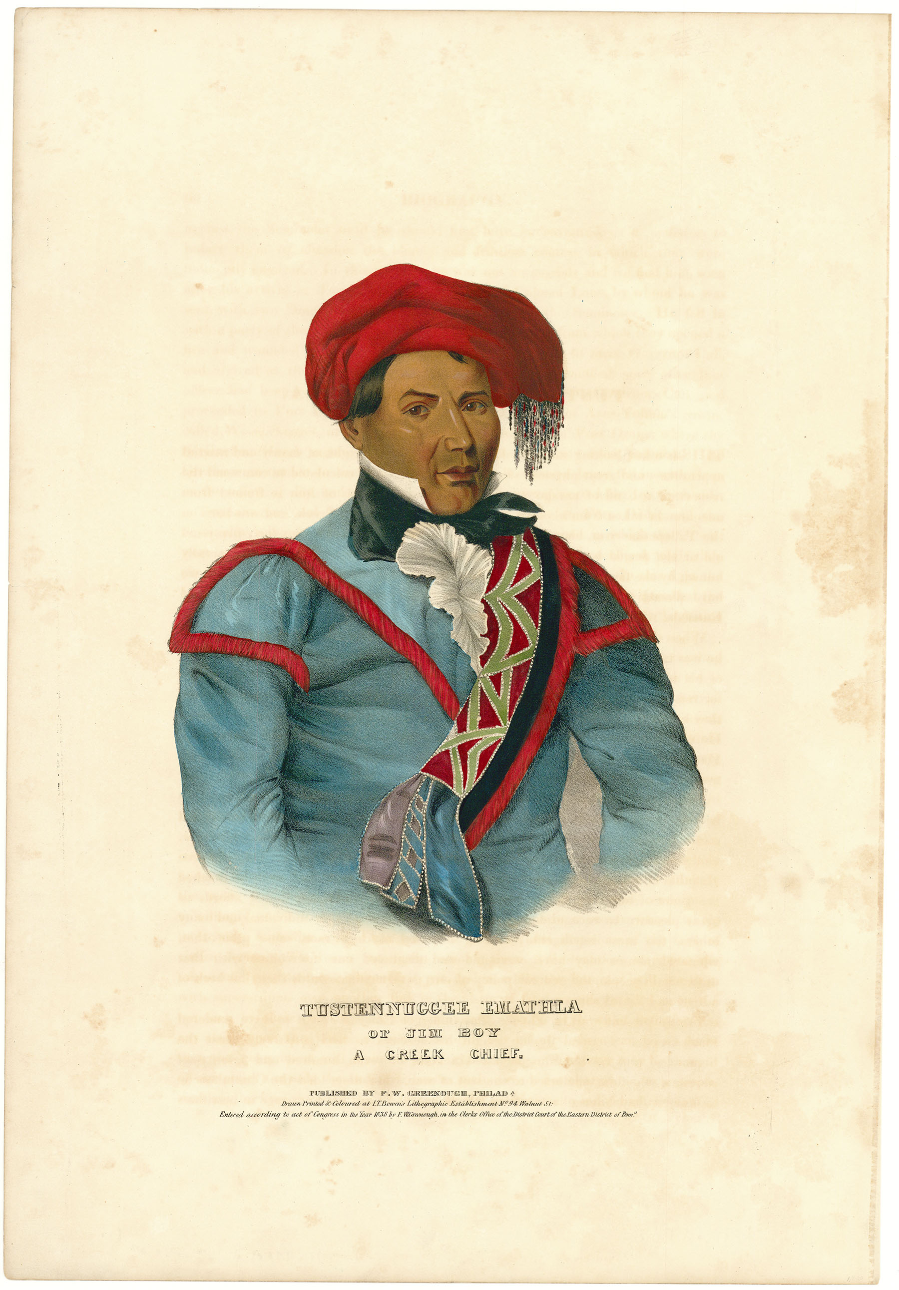DESCRIPTION: From the folio edition of the "History of the Indian Tribes of North America" by Thomas L. McKenney and James Hall. Published by F. W. Greenough, Philadelphia. Lithographed, printed and colored by J. T. Bowen, Philadelphia.<br><br>