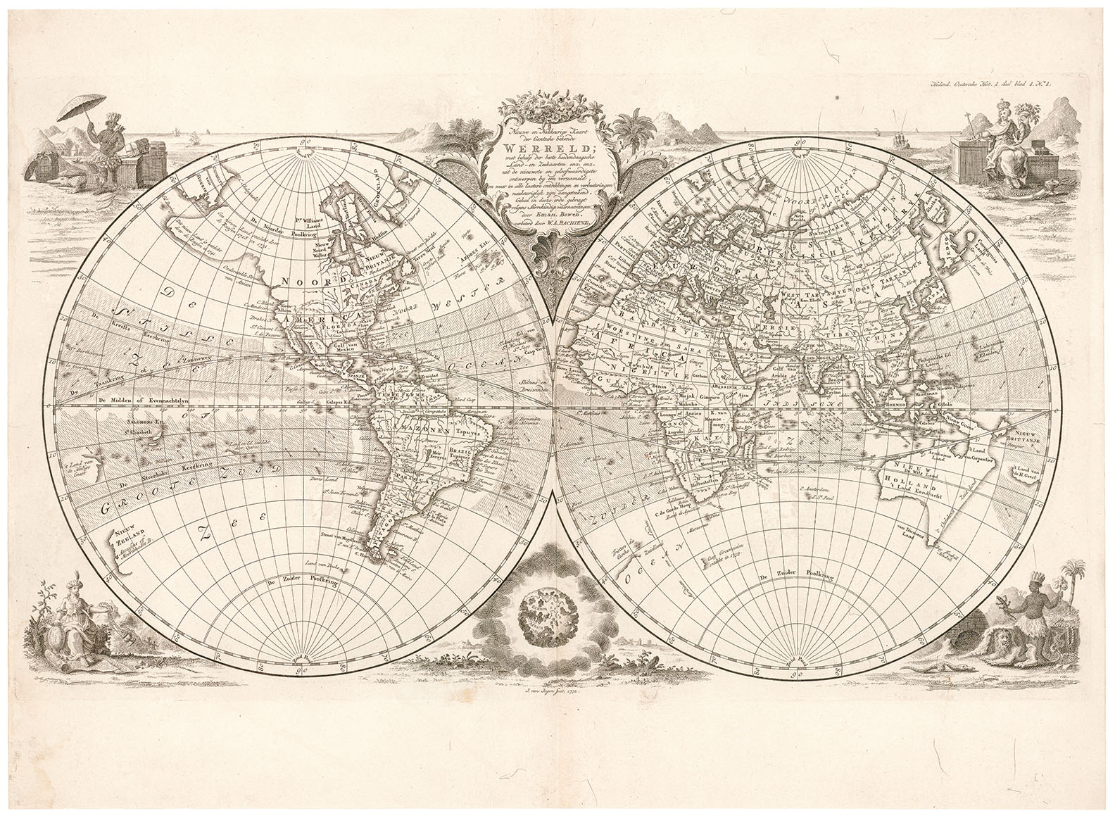 DESCRIPTION: A scarce double hemisphere map of the world. This map is a Dutch adaptation of Emanuel Bowen’s map reworked by the Utrecht theologian and geographer W.A. Bachiene.<br><br> Willem Albert Bachiene (1712-1783) was a Dutch preacher, geographer and astronomer. In 1764 he became professor in astronomy and geography at the 'Illustere School' of Maastricht. After 1769 he published maps based on Emanuel Bowen. In 1785 all his maps were published together in the Atlas part of 'Hedendaagsche Historie.<br><br> Four allegorical figures in the corners represent Europe, Asia, Africa and America. Australia's east coast is shown as a largely flat as theorized by Buache.