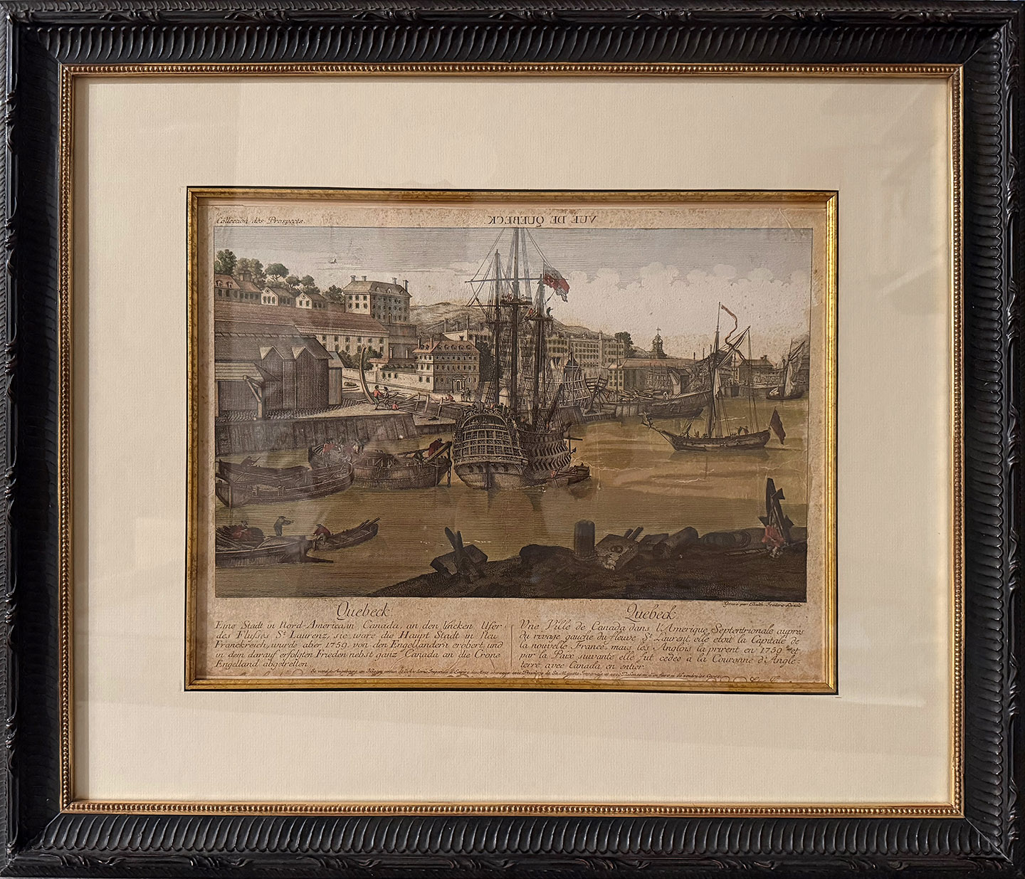DESCRIPTION: An 18th-century vue d’optique of the quayside of Quebec, engraved and published in Augsburg by Balthasar Friedrich Leizelt around 1775.<br><br> Designed for viewing through a zograscope, the print carries its French title reversed at the top—a deliberate feature that allowed the inscription to read correctly when seen through the optical device. The zograscope would give the view a three dimensional feel.<br><br> The scene presents an imagined view of Quebec shortly after the British capture of the city in 1759, accompanied by descriptive text in both German and French. Typical of Leizelt’s North American series, the architecture blends European forms with second-hand knowledge of the colonies, reflecting how continental audiences envisioned the New World. Brightly handcolored and composed with sharp perspectival recession, the sheet is a characteristic example of Augsburg optical views intended as parlor entertainments in the late 18th century.