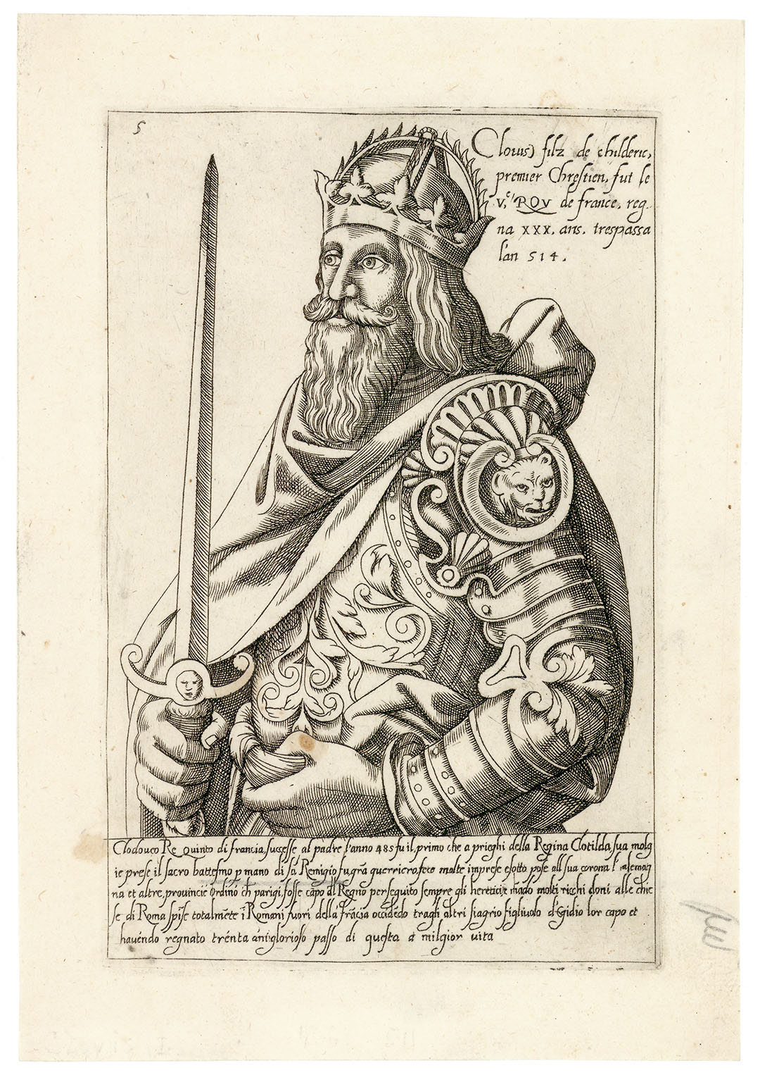 DESCRIPTION: This print depicts Clovis I, the first king to unite the Frankish tribes under a single ruler and the founder of the Merovingian line, whose reign from the late fifth to early sixth century marked a decisive turning point in the formation of early medieval France. Published in Venice by Bernardo Giunti in 1588 within Cronica breve de i fatti illustri de’ re di Francia, the engraving forms part of the chronicle’s sequential visual record of French rulers. Clovis is presented in the series’ standard bust-length format, defined by firm, controlled linework that emphasizes clarity of feature and composure. The portrait reflects his historical importance as the monarch who consolidated Frankish power, embraced Christianity, and laid the political and religious foundations upon which later French kingship would develop.