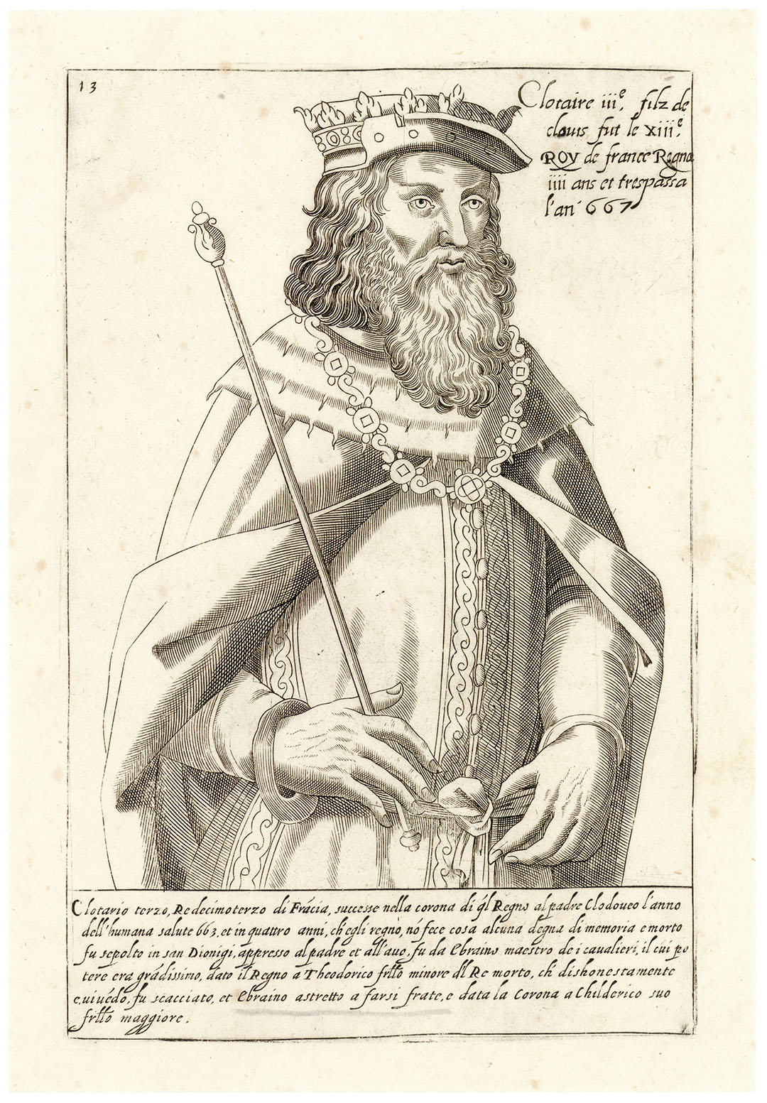 DESCRIPTION: This print depicts Chlothar III, a seventh-century Merovingian king who ruled Neustria and Burgundy from 657 until 673, during a time when royal authority had become largely ceremonial and effective power was exercised by the mayors of the palace. Published in Venice by Bernardo Giunti in 1588 as part of Cronica breve de i fatti illustri de’ re di Francia, the engraving belongs to the chronicle’s orderly visual record of the French monarchy. Chlothar is presented in the series’ characteristic bust-length format, defined by firm, restrained linework that offers a clear and composed likeness. The portrait situates him within the late Merovingian era, a period marked by diminishing kingship and the gradual transition toward the Carolingian ascendancy.