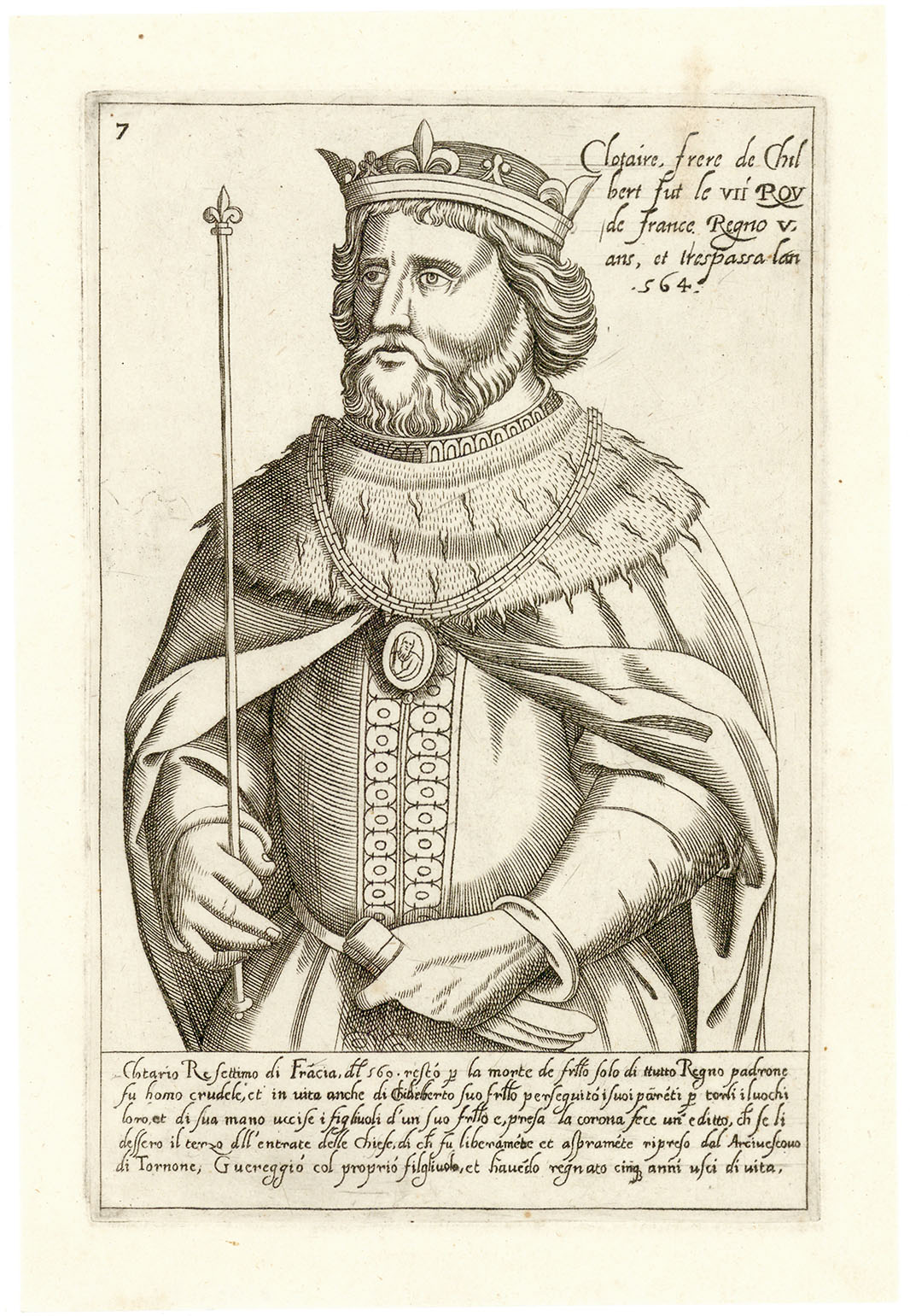 DESCRIPTION: This print depicts Chlothar I, one of the principal Merovingian kings and a son of Clovis I, whose long reign—extending from the early sixth century until his death in 561—saw the consolidation and periodic reunification of the Frankish realms. Published in Venice by Bernardo Giunti in 1588 within Cronica breve de i fatti illustri de’ re di Francia, the engraving contributes to the chronicle’s continuous visual sequence of French monarchs. Chlothar is shown in the series’ standard bust-length format, rendered with the firm, disciplined linework characteristic of the set, presenting a steady and recognizable likeness. The portrait reflects his historical role as a ruler who expanded Frankish power, navigated fractious partitions among his brothers, and ultimately reassembled the territories first united under his father, thereby shaping the political landscape of early medieval Gaul.