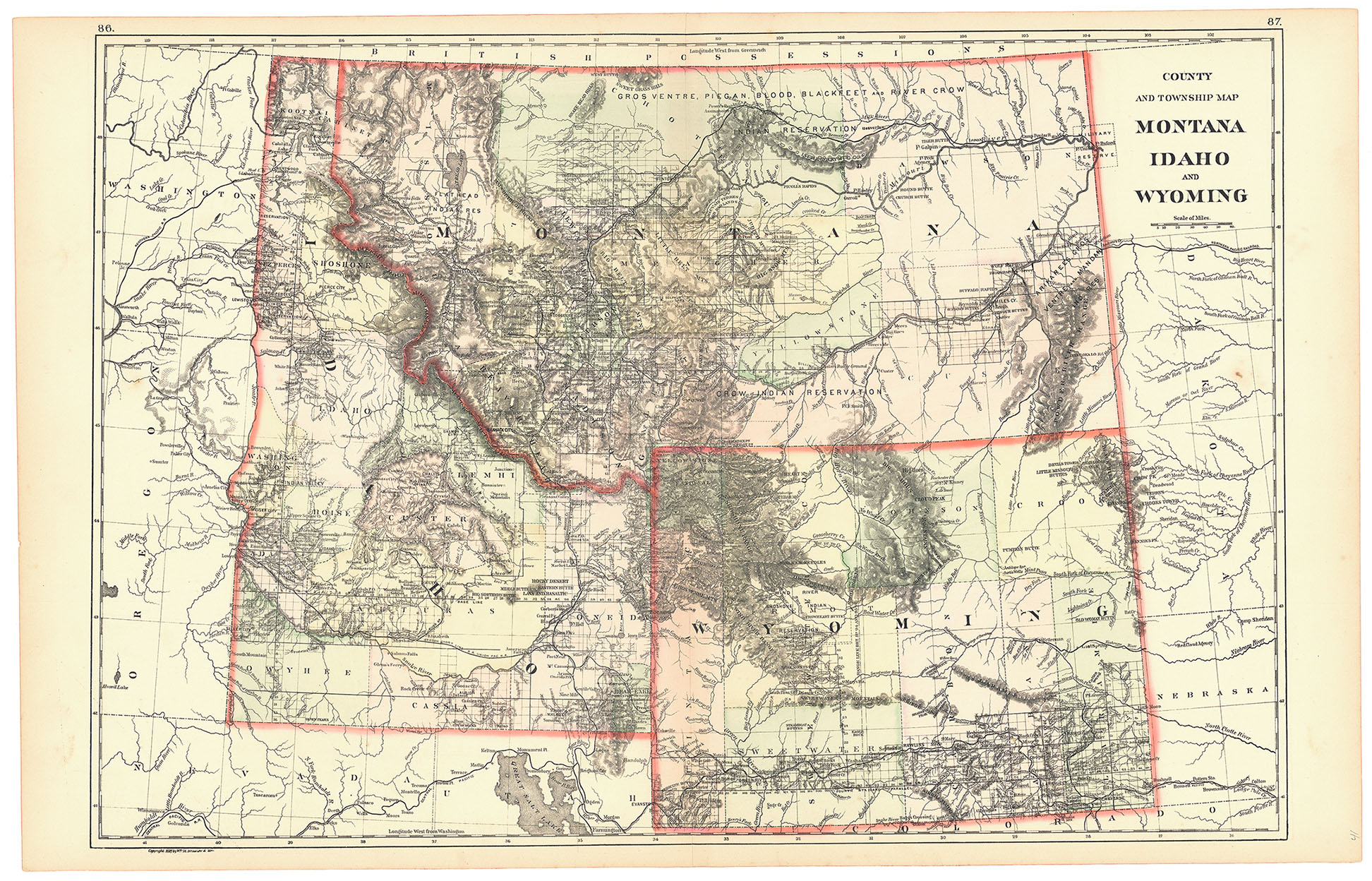 DESCRIPTION: An interesting early map of these three states, each colored by counties. Shows railroads, forts, buttes, mountain ranges, rivers, lakes, Indian reservations, and other details. This map appeared in Mitchell's "New General Atlas." Yellowstone is noted as a national park.