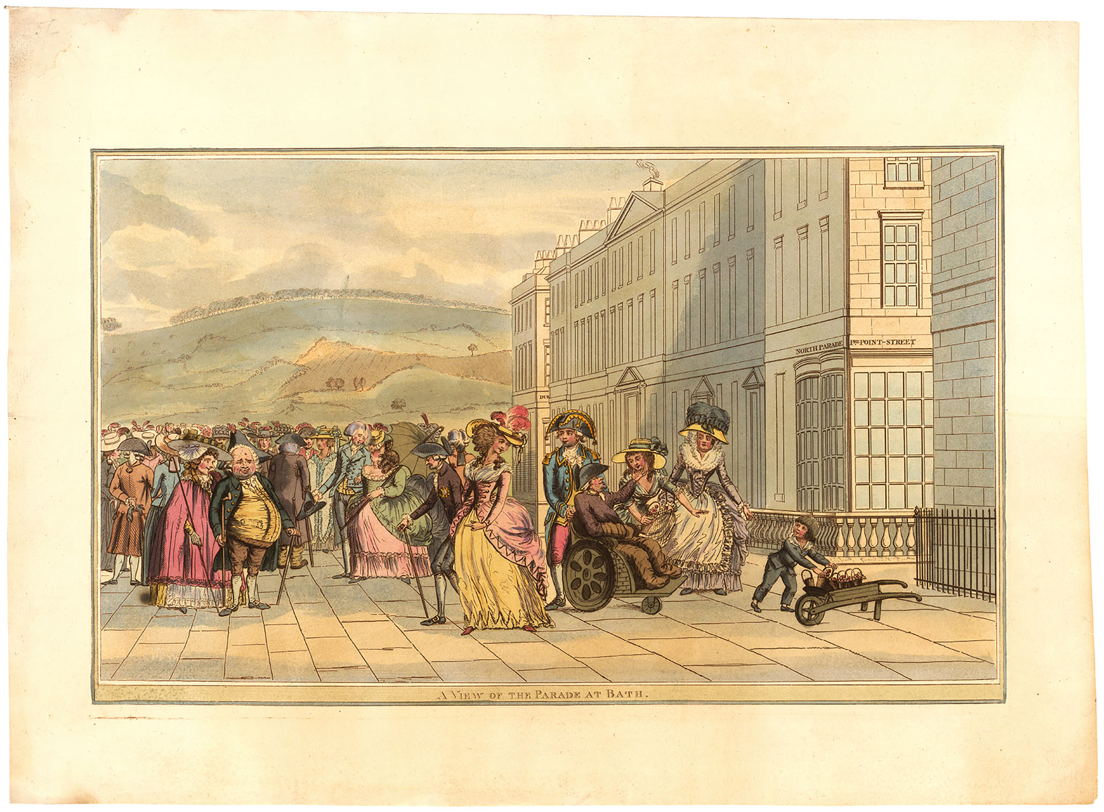 DESCRIPTION: A beautiful aquatint satirical engraving depicting a scene on North Parade Street in the town of Bath, England. It is satirising the "high" society at Bath. A gouty old man in a chair eyeing up a young lady being chaperoned by an old lady. A beautiful young lady accompanies a lean older man, but looks wistfully back at the young gentleman pushing the wheelchair. It has been suggested that the artist of this is Humphrey Repton.