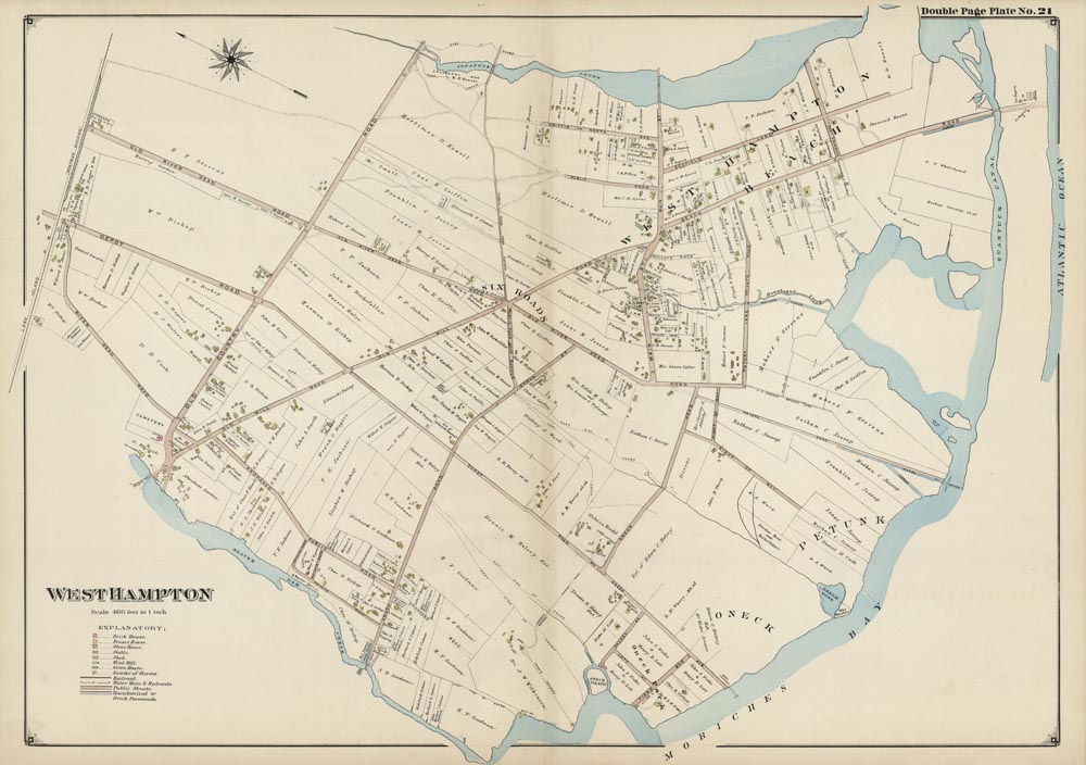 DESCRIPTION: A detailed map of the village. North is oriented to the left. Shows from the railroad to the ocean. Beaver Dam Creek to Aspatuck Creek. Notes building owners, lots and structures. This map appeared in Hyde's very scarce oversized "Atlas of Suffolk County Long Island, New York... South Side - Ocean Shore.” Drawn on a scale of 400 feet to the inch.