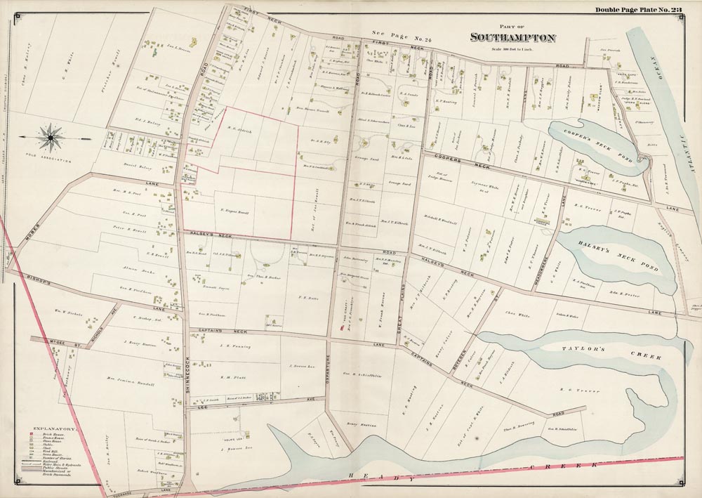 DESCRIPTION: A detailed map of the village. North is oriented to the left. Shows from Moses and Bishop's Lane to the bay, Heady Creek to First Neck Road and the ocean. Includes Cooper's Neck Pond, Halsey's Neck Pond and Taylor Creek. Notes building owners, lots and structures. This map appeared in Hyde's very scarce oversized "Atlas of Suffolk County Long Island, New York... South Side - Ocean Shore.” Drawn on a scale of 300 feet to the inch.
