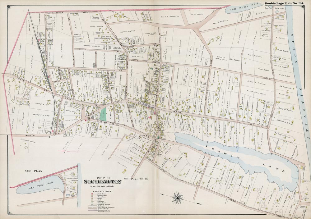 DESCRIPTION: A detailed map of the village. North is oriented to the left. Shows an area from just north of the railroad to the ocean. First Neck Road to the west, old town pond to the east. Includes Agawam Lake. Notes building owners, lots and structures. This map appeared in Hyde's very scarce oversized "Atlas of Suffolk County Long Island, New York... South Side - Ocean Shore.” Drawn on a scale of 300 feet to the inch.