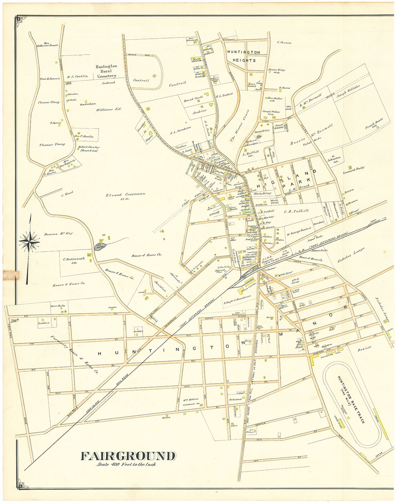 DESCRIPTION: A detailed map of the Huntington Station in Huntington township. The map is roughly centered on the train station. Notes building owners, lots and structures. This map appeared in Hyde's very scarce oversized "Atlas of Suffolk County Long Island, New York... Sound Shore.” This map is a fragment from a larger map that had multiple village maps.