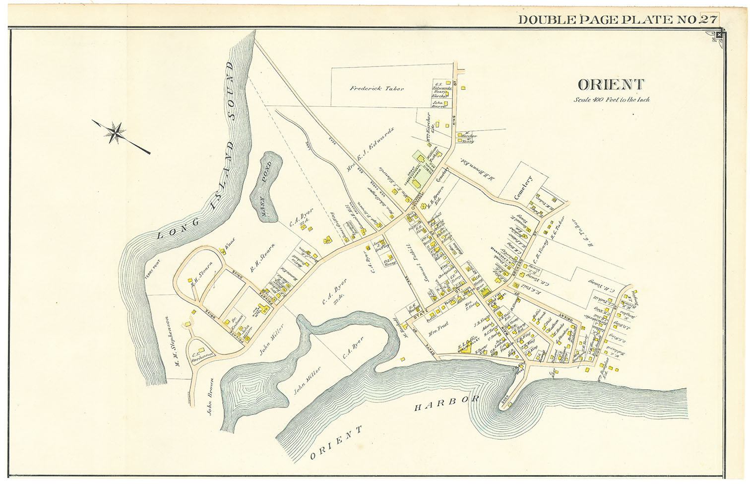 DESCRIPTION: A detailed map of the hamlet of Orient at the far east end of the North Fork. Notes building owners, lots and structures. This map appeared in Hyde's very scarce oversized "Atlas of Suffolk County Long Island, New York... Sound Shore.”<br><br> This map is a fragment from a larger map that had multiple village maps.