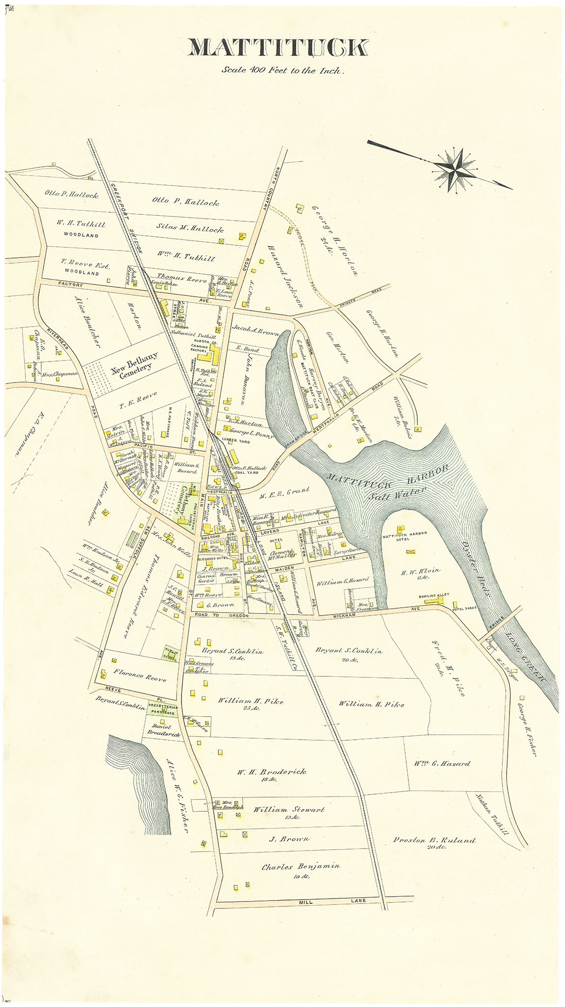 DESCRIPTION: A detailed map of the village of Mattituck on the North Fork of eastern Long Island. Notes buildings, their owners, lots and structures. This map appeared in Hyde's very scarce oversized "Atlas of Suffolk County Long Island, New York... Sound Shore.”<br><br> This map is a fragment from a larger map that had multiple village maps.