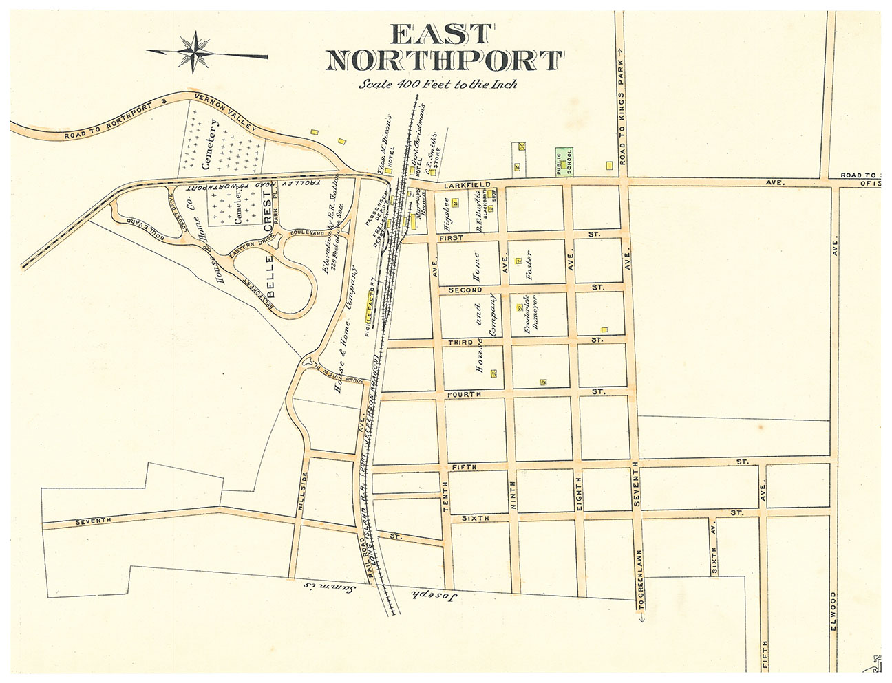 DESCRIPTION: A detailed map of the village of East Northport in the area surrounding the Northport rail road station. Notes building owners, lots and structures. The Northport trolley is shown. This map appeared in Hyde's very scarce oversized "Atlas of Suffolk County Long Island, New York... Sound Shore.”<br><br> This map is a fragment from a larger map that had multiple village maps.
