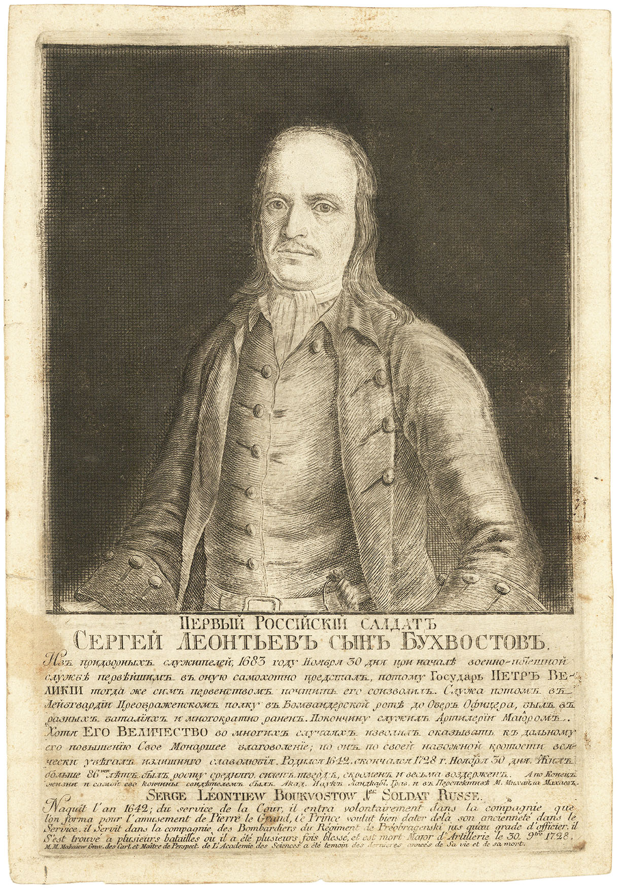DESCRIPTION: No publisher or engravers name given.<br><br> A fine portrait of Sergei Leontievich Bukhvostov, (1642-1728). The first Russian soldier.<br><br> The Russian Guards began in the era of Peter the Great and is inextricably linked with the reformist policies of Peter I. In 1683, 11-year-old Peter Alekseevich Romanov, crowned by the kingdom, created the famous amusing regiments. Initially, they were created solely in order to "amuse" the young king who was fascinated by military art. The first Russian guard was Sergei Leontievich Bukhvostov - a former royal groom, who joined the amusing regiment. In 1692, the amusing soldiers of Peter were consolidated into the 3-th Moscow Elective Regiment, commanded by Auton Mikhailovich Golovin, and divided into two regiments, Preobrazhensky and Semenovsky. In 1700, the funny Preobrazhensky and Semenovsky regiments were given the names of the Life Guards..
