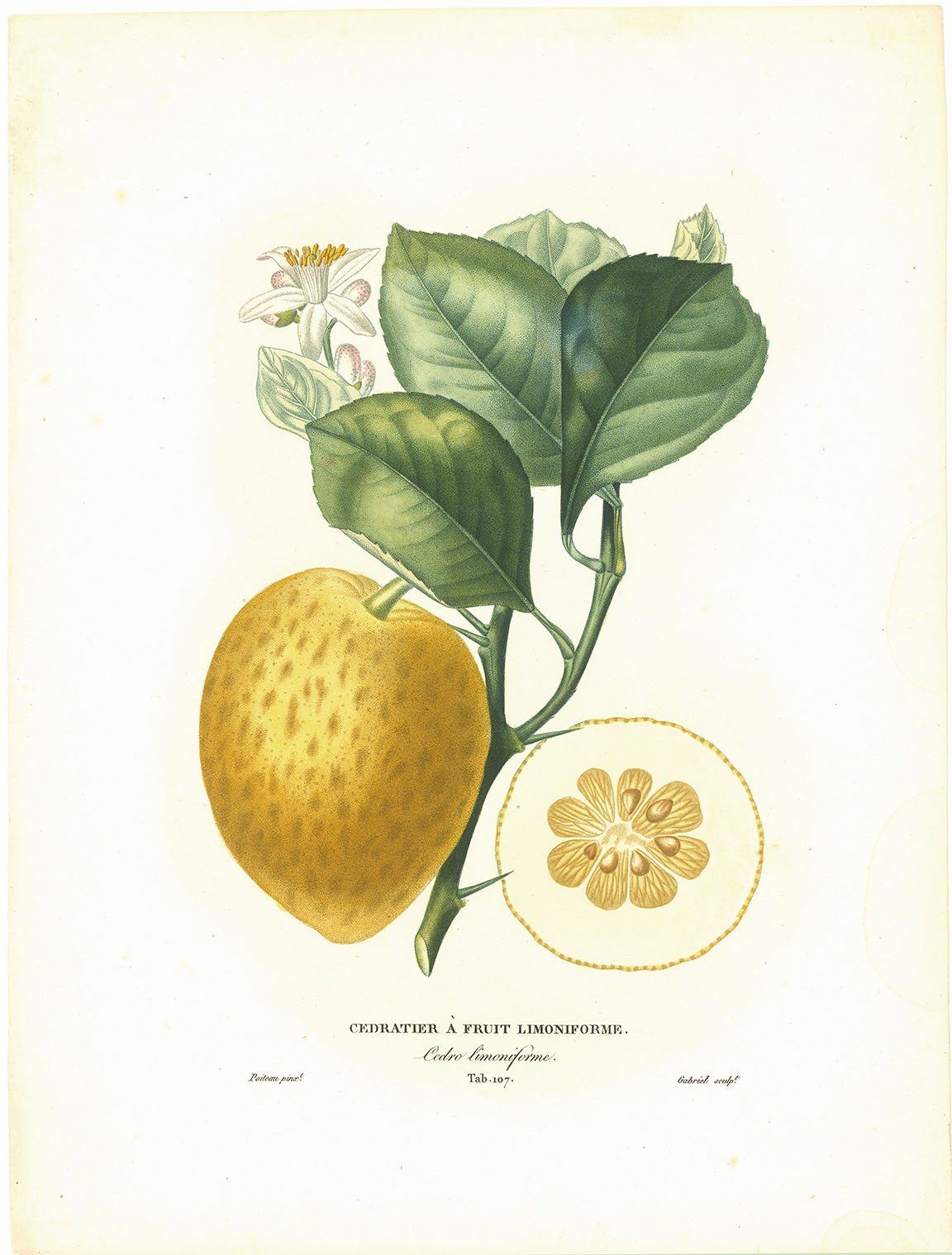 DESCRIPTION: Tab. 107. Poiteau pinxt. Gabriel sculpt. From "Histoire Naturelle des Orangers" by A. Risso and A. Poiteau.<br><br> This beautiful work "contains exquisite drawings of every known variety of orange, lemon and grape fruit, and their congeners, fruits that hang from the leaves, alternately like suns or moons, with every kind of rind, and shaped like gourds or pitchers ... or again, authentic globes of fire, whether pale, as of moonlight, or red-gold like the sun but half-hidden, as in poetry, in its own green shade. A beautiful and inspiring work, in its way not less so than Redoute's Les Liliacees ... or Les Roses" (Sacheverell Sitwell, Great Flower Books)<br><br> Antoine Risso, a French apothecary and botanist, lived and worked in Nice in the south of France. Antoine Poiteau, the illustrator, began his career as an apprentice gardener at the Jardin des Plantes, and spent some time in the Caribbean collecting plants before returning to Paris in 1800 and turning to botanical illustration, with an initial style modelled on Van Spaendonck and Redoute.