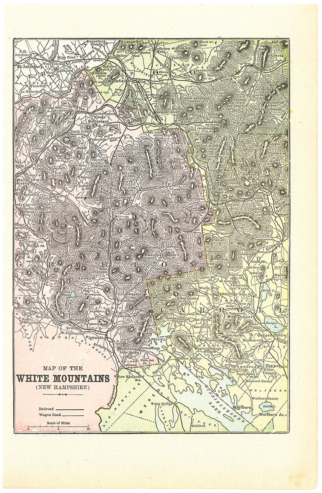 DESCRIPTION: From "Cram's Superior Atlas of the World." Lake Winnipesaukee is in the lower right and St. Johnsbury, Vermont in the upper left. Key notes railroad lines and wagon roads.