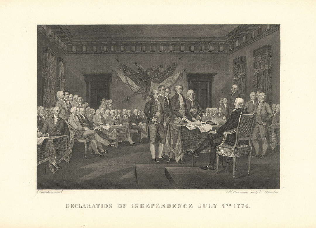DESCRIPTION: A fine small engraving taken from John Trumbull's painting. Engraved by I.W. Baumann.<br><br> John Trumbull worked on the painting for this iconic image for thirty three years. He began the painting at Thomas Jefferson’s residence in Paris, utilizing Jefferson’s first-hand accounts of the event. Jefferson also made a rough sketch of the assembly room at Independence Hall that Trumbull used. Trumbull dedicated himself to portraying from life as many of the forty-eight signers as he could, which is one of the reasons the painting was not completed until 1818.