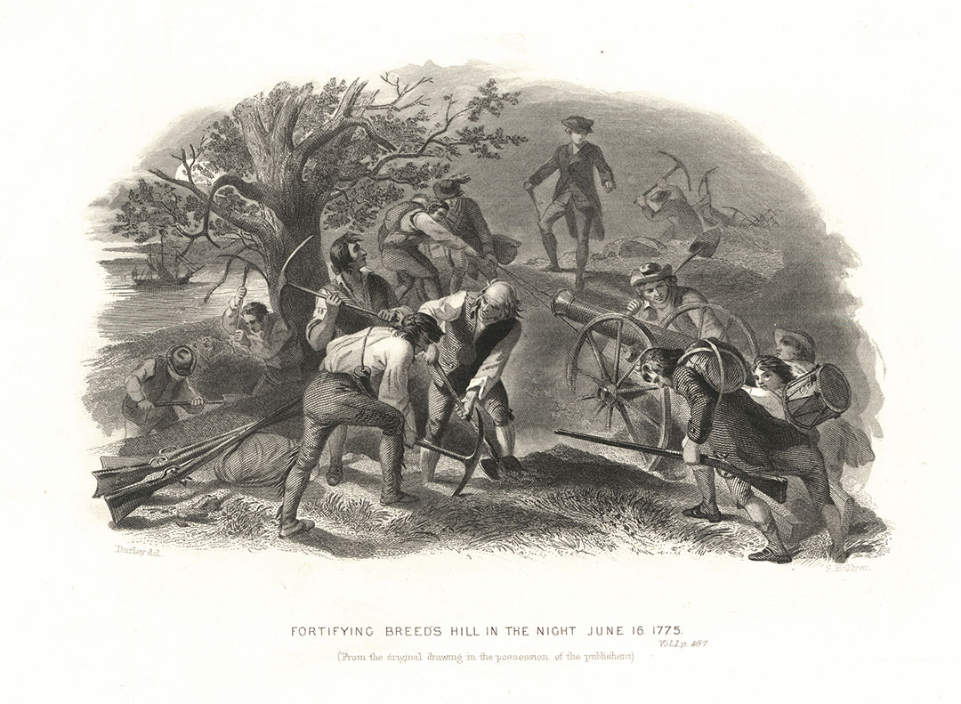 DESCRIPTION: Engraved by Samuel Hollyer.<br><br> During the night of June 16, 1775, hundreds of men were sent in to Breed's Hill to construct a redoubt. Originally, the site for this fort was to be Bunker's Hill, but Breed's Hill was closer to Boston. It was decided to secretly set up this defensive fort during the night because it was learned that the British troops were soon going to occupy Dorchester Heights. By dawn on the 17th, the British had discovered the new American fort, and decided to attack. This attack resulted in what became known as the Battle of Bunker Hill.