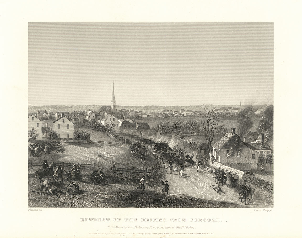 DESCRIPTION: After a painting by Alonzo Chappel. Engraved by James Smillie.<br><br> That fateful day, often remembered as the "shot heard 'round the world," marked the transition from colonial agitation to full-scale armed conflict. The events at Lexington and the North Bridge in Concord demonstrated that the localized militia could effectively stand against the professional British Army.<br><br> By the time the British retreated to Charlestown, they had suffered roughly 273 casualties, compared to the 95 casualties sustained by the Americans, signaling that a return to peaceful British rule was no longer possible.