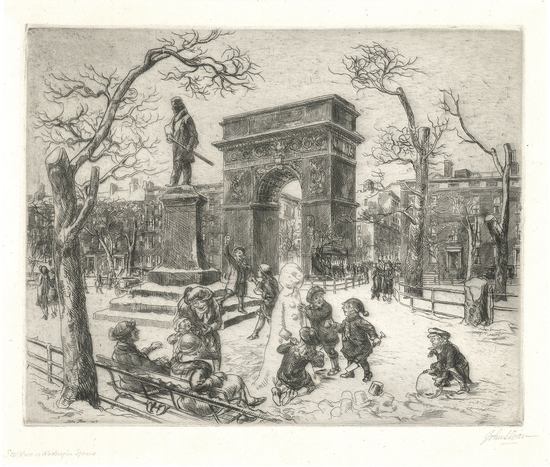 DESCRIPTION: "The title refers to the Garibaldi statue, the Washington Arch, the snow man, and the helter skelter Tammany tree surgery. A lot of funny cripples in the way of trees. The life of Washington Square furnished me with much material. I often regret leaving the neighborhood." John Sloan, 1945.