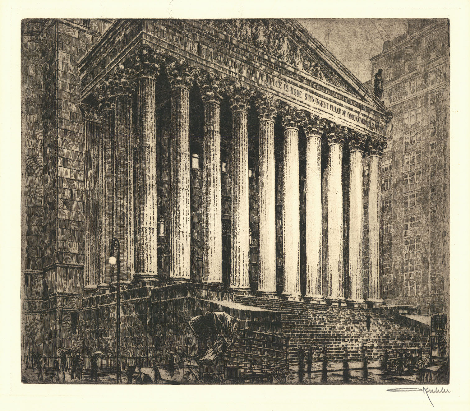 DESCRIPTION: The subject of the print is the New York County Courthouse, commonly referred to as the New York State Supreme Courthouse, an imposing neoclassical building located on Foley Square in lower Manhattan. Designed by architect Guy Lowell and completed in 1927, the structure is characterized by its grand Corinthian colonnade, monumental scale, and broad, elevated steps, embodying the ideals of civic authority and judicial permanence.