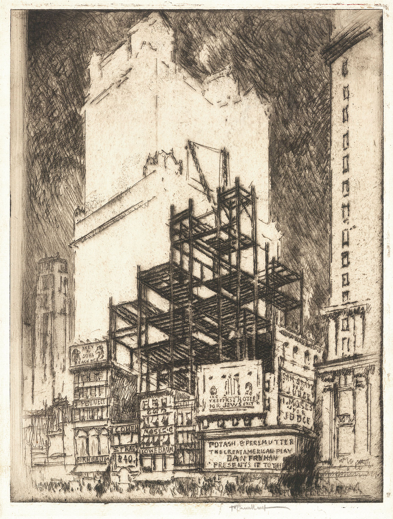 DESCRIPTION: An original 1923 drypoint by Joseph Pennell titled Building New York, 7th Avenue, NYC. This work captures the energy of the city during a time of massive growth, focusing on the steel-frame construction and rising heights that defined modern New York. Pennell uses a low vantage point to make the building feel monumental, emphasizing its great scale and verticality. Working in drypoint, he creates rich, velvety lines that give the architecture a sense of weight and solid structure. The expressive linework conveys both the physical texture of the construction site and the constant movement of the urban environment. It is a masterful record of the technological progress and architectural change of the 1920s.
