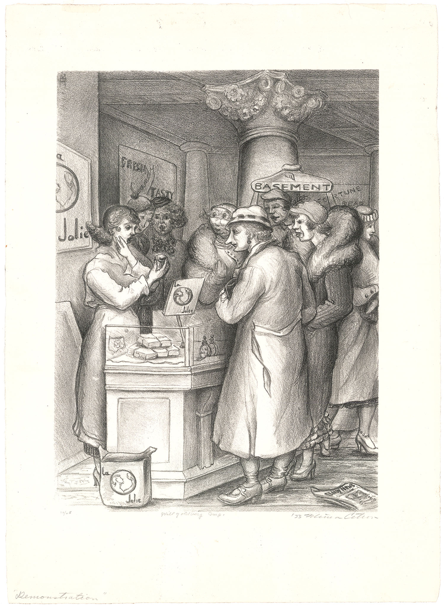 DESCRIPTION: Demonstration reflects the broader concerns of Social Realism, an artistic movement that sought to represent the lived experiences of ordinary people while engaging critically with issues of inequality, labor, and justice. Produced in 1933, at the height of the Great Depression, the print stands as both a compelling work of art and a document of its time, embodying the intersection of artistic practice and social commentary in early twentieth-century American printmaking.