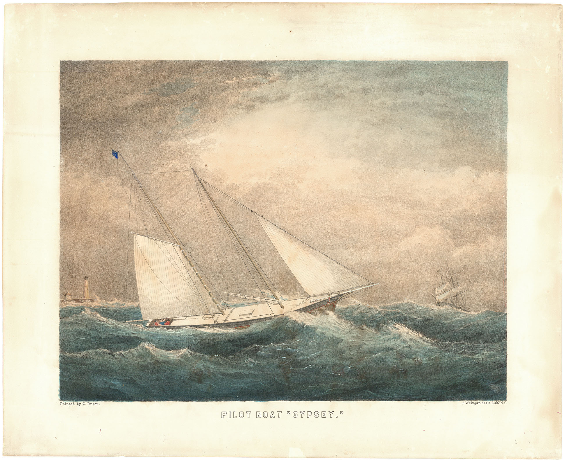 DESCRIPTION: This lithograph depicts the pilot boat Gypsey battling heavy seas, beating to windward through a gale to meet an incoming vessel. Clement Drew, known for his coastal and maritime paintings, often portrayed ships under difficult conditions, emphasizing both seamanship and the power of the sea. The image captures the tension and skill required of pilots who guided larger vessels safely to harbor. Lithographed by A. Weingartner in New York, this work reflects the strong 19th-century American interest in maritime subjects and the respect held for pilot crews along the Atlantic coast.