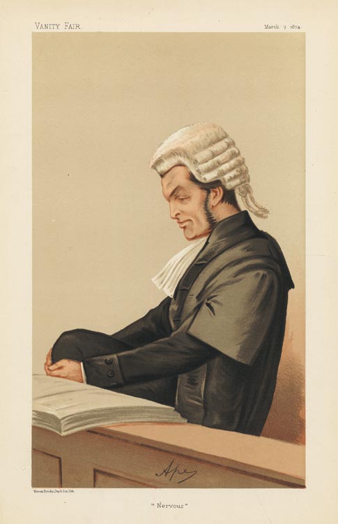 DESCRIPTION: An image of Sir Henry James after a drawing by Ape. Printed by Vincent Brooks Day & Son. One of a fine group of portraits of lawyers and judges produced by Vanity Fair.