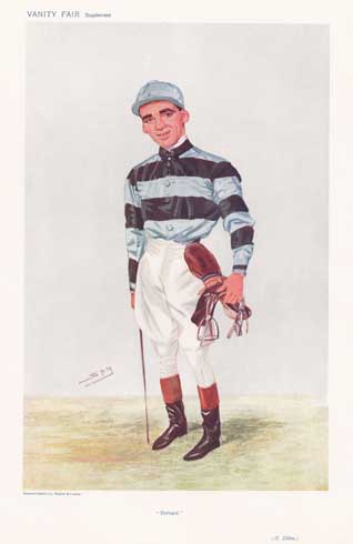 DESCRIPTION: An image of Bernard Dillon after a drawing by "Spy" (Leslie Ward). Printed by Bemrose Dalziel Ltd. One of a fine group of thirty four portraits of Jockeys produced by Vanity Fair.