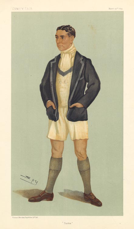 DESCRIPTION: An image of Mr. Harcourt Gilbey Gold after a drawing by Spy. Printed by Vincent Brooks, Day & Son.. One of a fine group of twenty two portraits of prominent scullers produced by Vanity Fair.<br><br> The President of the Oxford University Boat Club, who hopes to stroke his fourth ‘Varsity Eight to victory on Saturday, became the fourth (and last) son of Mr. Henry Gold, of Hedsor, in Bucks, three-and-twenty years ago. Having acquired the name of “Tarka” in the nursery when his own name was too big for him, he went to Eton; where he is still remembered in “Hoppy’s” House. He took to the oar so well that for three successive years he stroked the Eton Eight to victory in the Race for the Ladies’ Plate at Henley; and his memory is so strong that Eton has gone on winning that Plate ever since. So he was made Captain of the Boats -- after he had got his Field Colours for football; and, accordingly, like so many good Eton oars, went to Oxford, to provide Magdalene College with a credit to the Isis. He was made stroke of the ‘Varsity Eight right off; and in his first race he cut Cambridge down almost on the post, winning after a desperate struggle. In 1897 he stroked one of the best Oxford Eights ever sent out, and won again; and last year he was able to watch Cambridge rowing after him to the Ship. Besides this, he stroked Leander at Henley in 1896, when he won the Grand Challenge and defeated Yale; and, though New College just beat him the year after, he won the same race at last year’s Regatta; while in two of three years he also stroked the Leander Four to victory in the race for the Stewards’ Cup. Yet with all these and other triumphs he has never won a race at Eton or Oxford with the single exception of the ‘Varsity Pairs in 1897