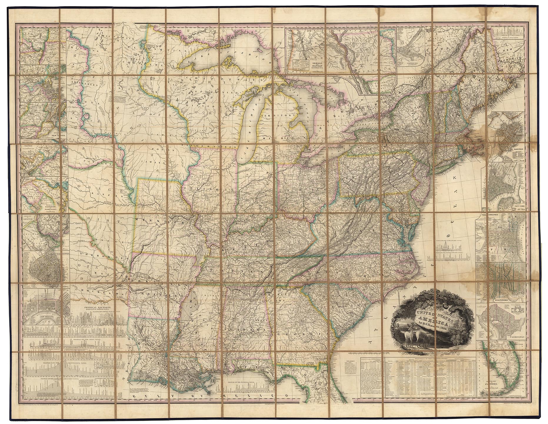 DESCRIPTION: "Tanner undertook the ambitious task of compiling a large map, the United States of America, which he copyrighted on June 10, 1829. It is at a scale of 1:2,000,000, somewhat larger than Melish's 1816 map of the United States. Melish's map, however, extends westward to the Pacific Ocean, whereas Tanner's map terminates just west of the upper course of the Missouri River. Tanner's the United States of America has thirteen inset maps, principally of cities and their environs, a statistical table, and profiles of several canals and railroad rights of way…" The main map is surrounded by inset maps of fourteen cities, South Florida, Oregon and the Mandan Districts (with a chart of the Outlet of Oregon River), two statistical tables, and fourteen profiles of portages, canals, and railroads. Latitude is measured from Washington, D.C., making this a truly "American" map. "This is one of the best early large maps of the United States and the premier map for its period." David Rumsey. The map was engraved by Tanner with assistance by E.B. Dawson, and W. Allen. The title cartouche, which pictures a country landscape with two deer in the foreground, was engraved by J.W. Steel. A very fine copy in a case map format.