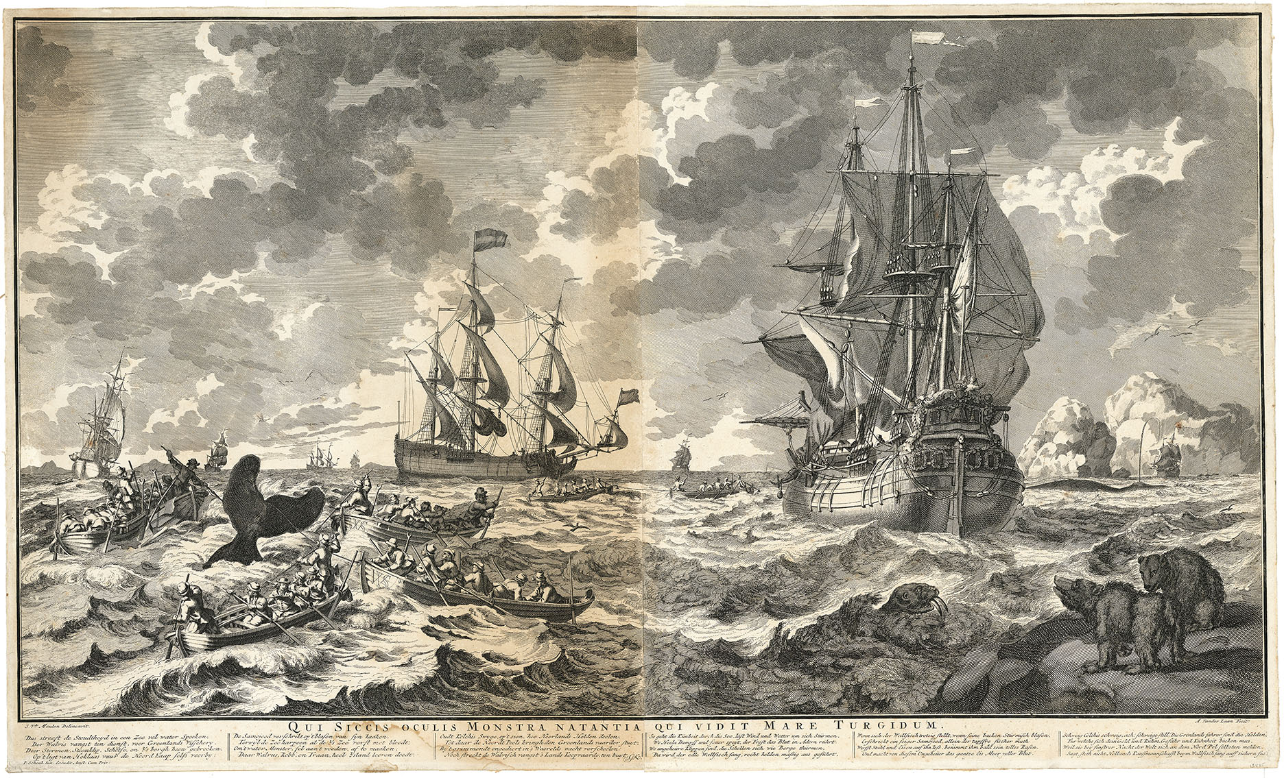 DESCRIPTION: Two-plate engraving joined in the center. S. Vdr. Meulen Delineavit (drawn by). A. Vander Laan Fecit (engraved by). P. Schenk Iun: Excudit amst: cum priv:. Poem below title reads as follows: "Much bravery is shown by those, who in a sea full of water-ghosts / Face icebergs, storms, and rocky cliffs, / For catching whales on Greenland's shores / Only guided, even beyond North Cape, by Hecla's glow. / Samoyeds are afraid when they see the spouting whales / As the raging monsters are chased and killed / And sea harpoons paint the Ice-Sea red with blood. / But Iceland lives from walrus, oil and seal. / The brave take care of Holland's growing trade. / Be silent, Colchis, and see how Holland's heroes rove / Searching beastly monsters in the northern darkness / Until the Polar Circle's ice the whalemen holds." Translation taken from "Whaling Prints in the Francis B. Lothrop Collection" by Elizabeth Ingalls, p.14.