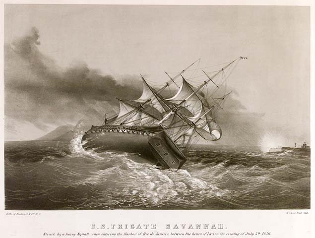 DESCRIPTION: Dramatic depiction of a sailing vessel, the frigate "Savannah," leaning heavily toward the starboard side in a squall. Lithograph of Endicott & Co., New York. "Wicked Ned" Del.<br><br> A scarce print.